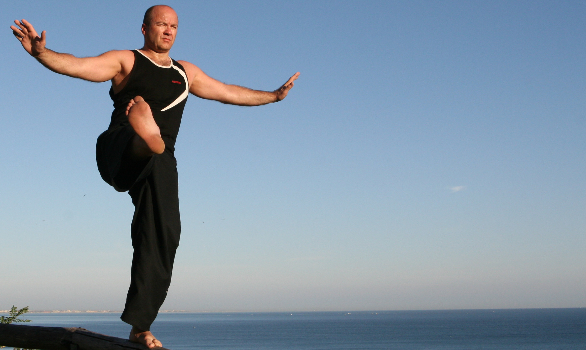 Üben an der Sprossenwand. Die Hüfte wird für den Yop-Chagi aufgedreht. Im Gürtel steckt der Kurzstock "Danbong" der ab dem 2. Dangrad zum festen Technikbestandteil wird.